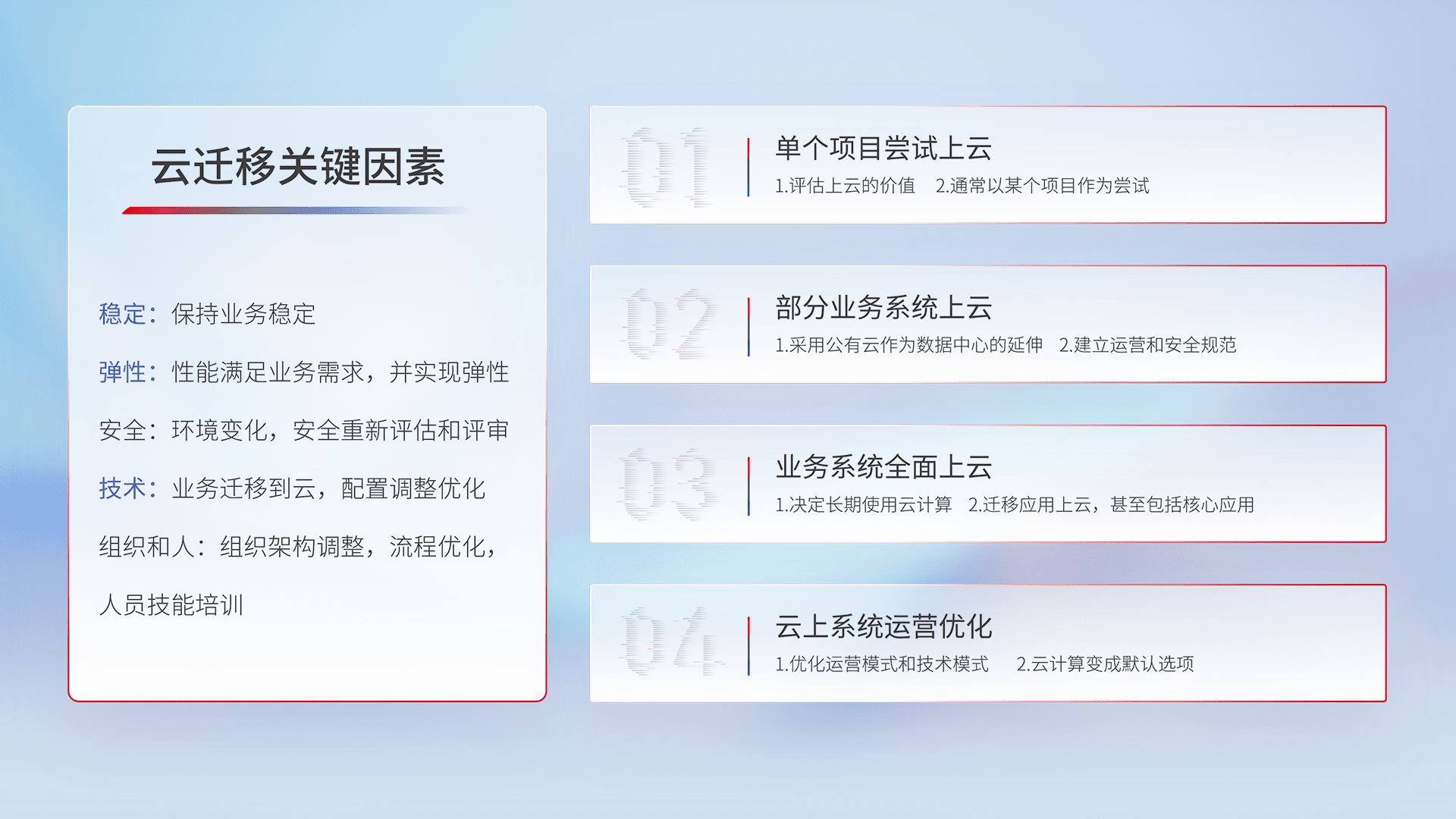 结合实际业务,,,从规划设计、、、云平台选型、、云原生改造、、、数据迁移、、、集成交付,,,迁移全过程为客户识别最佳上云路径,,,,做好风险识别管理,,,设计网络架构、、、身份权限、、、安全审计合规、、、操作审计、、日志审计、、监控告警策略、、多站点容灾设计等,,,,对云上基础设施进行整体规划,,,,提升IT治理水平,,,,以满足弹性、、、、高可用、、高性能的需求。。。